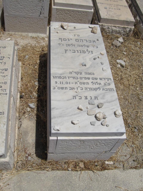 "פ"נ אברהם יוסף ב"ר שלמה זלמן ז"ל זלמנוביץ נספה עקד"ה וקידש שם שמים בחייו ובמותו כ"ג אלול תשס"א- 9.11.01 והובא לקבורה כ"ז אב תשס"ב תנצב"ה " אברהם יוסף זלמנוביץ