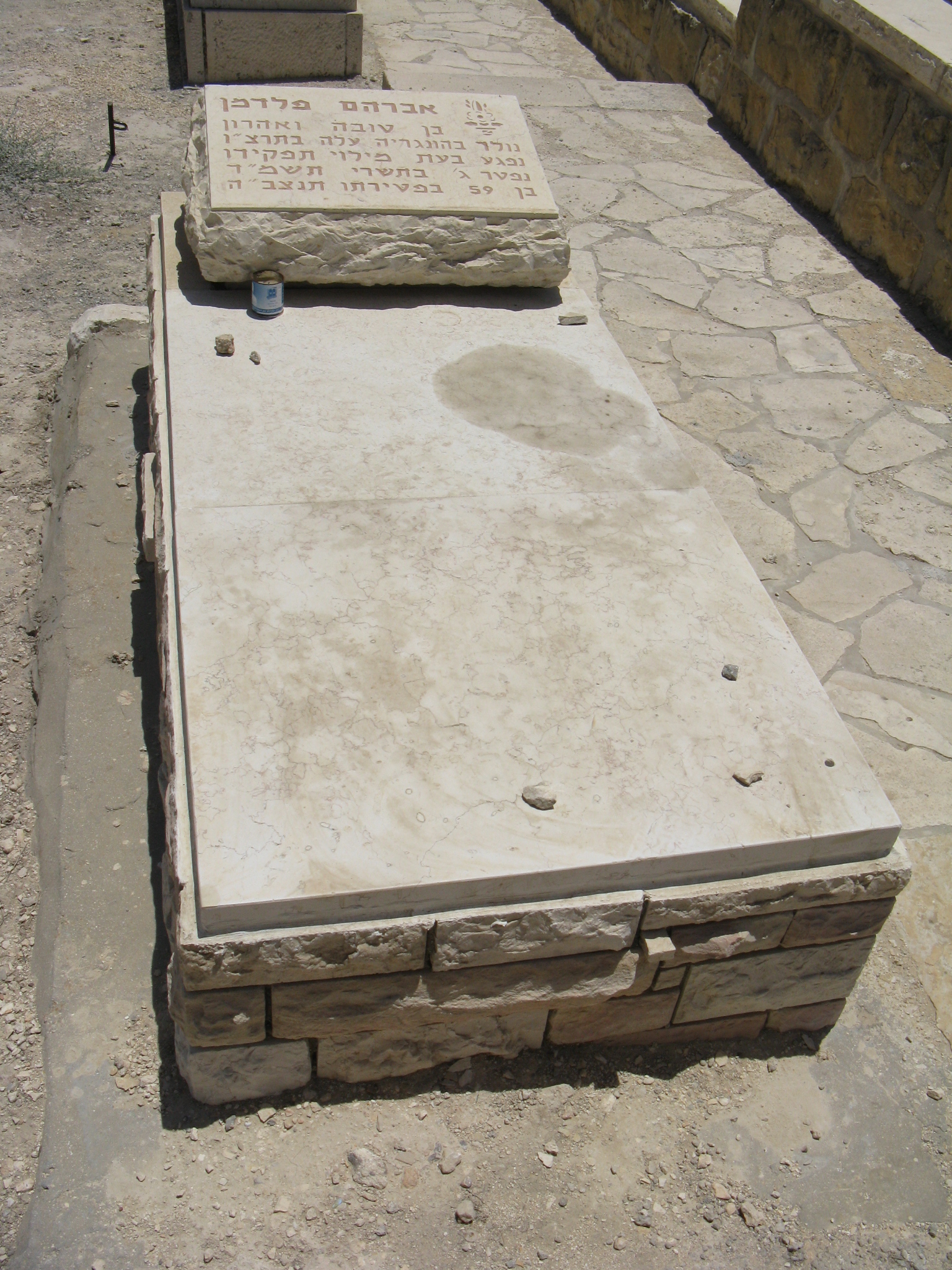 "אברהם פלדמן בן טובה ואהרון נולד בהונגריה עלה בתרצ"ו נפגע בעת מילוי תפקידו נפטר ג' בתשרי תשמ"ד בן 59 בפטירתו תנצב"ה "