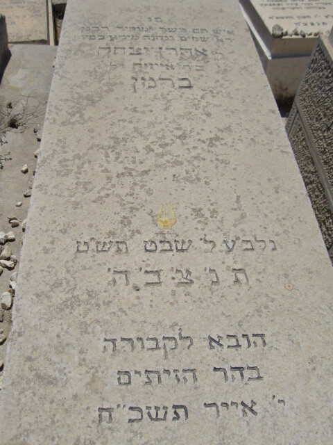 "פ"נ איש תם וישר ומוקיר רבנן ירא שמים ונהנה מיגיע כפיו ר' אהרן יצחק ב"ר אייזיק ז"ל נלב"ע ל' שבט תש"ט ת'נ'צ'ב'ה' הובא לקבורה בהר הזיתים י' אייר תשכ"ח " אהרן יצחק ברמן