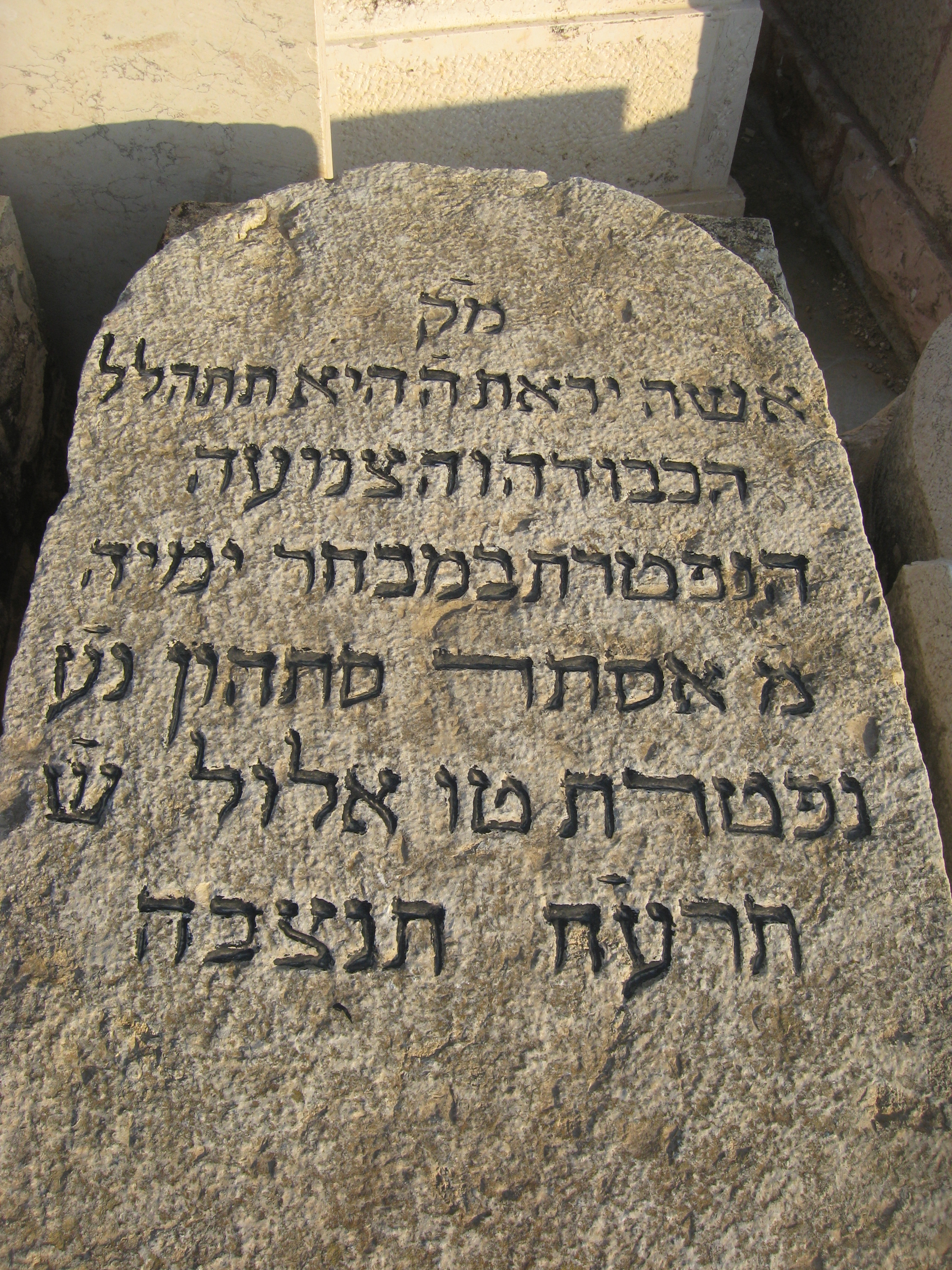 "מ'ק אשה יראת ה' היא תתהלל הכבודה והצנועה הנפטרת במבחר ימיה מ' אסתר סתהון נ'ע נפטרת טו אלול ש' תרע'ח תנצבה אסתר סיתהון ט"ו אלול תרע"ח תנצב"ה" אסתר סיתהון