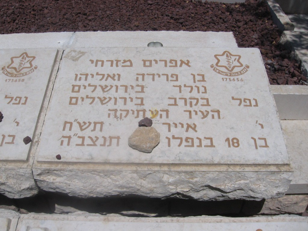 "אפרים מזרחי בן פרידה ואליהו נולד בירושלים נפל בקרב בירושלים העיר העתיקה י' אייר תש"ח בן 18 בנפלו תנצב"ה " אפרים מזרחי