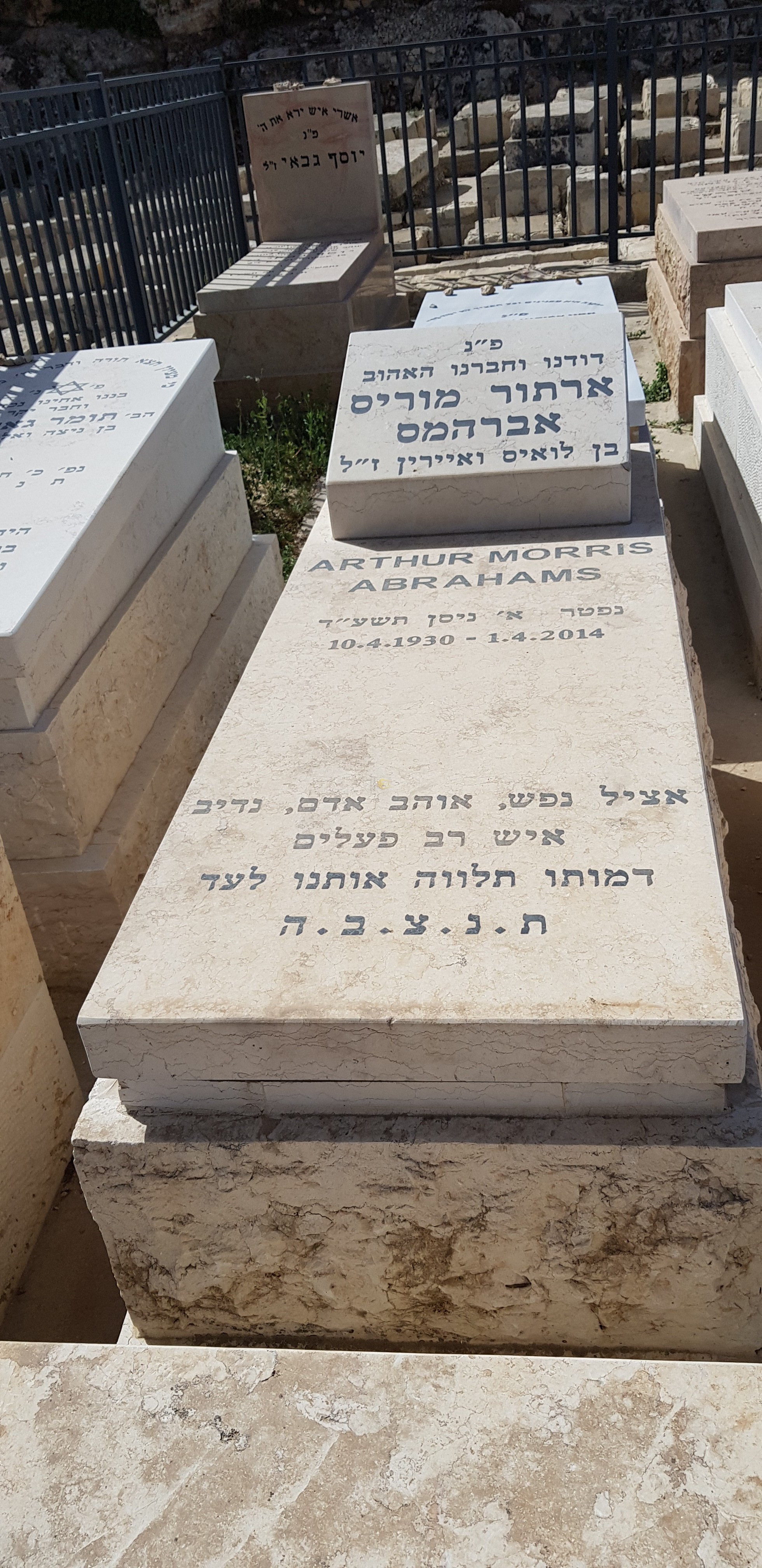 "פ"נ דודנו וחברנו האהוב ארתור מוריס אברהמס בן לואיס ואיירין ז"ל נפטר א' ניסן תשע"ד 10.4.1930 -1.4.2014 אציל נפש,אוהב אדם נדיב איש רב פעלים דמותו תלווה אותנו לעד ת.נ.צ.ב.ה " ארתור מוריס אברהמס
