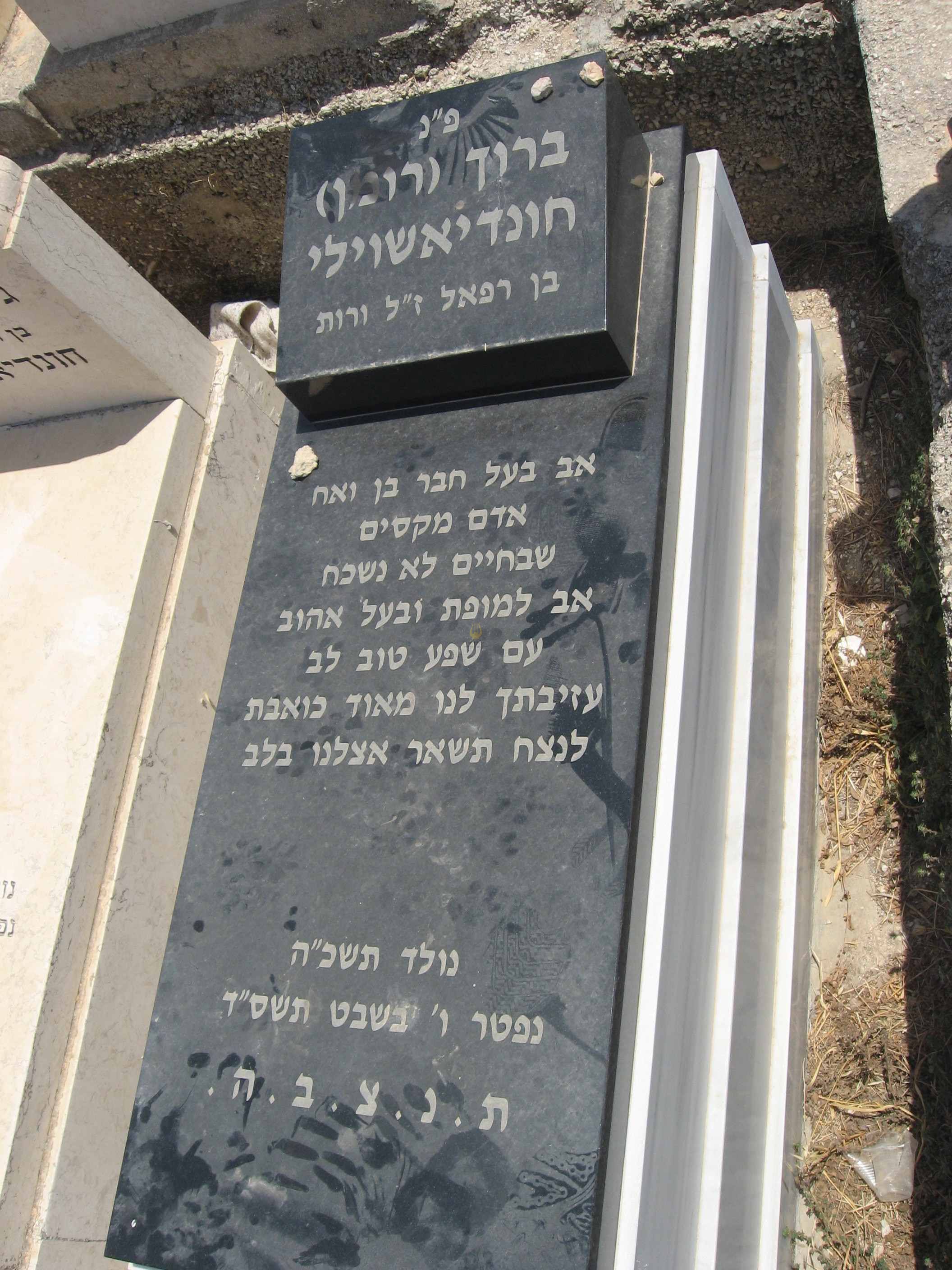 "פ"נ ברוך (רומן) חונדיאשוילי בן רפאל ז"ל ורות אב בעל חבר בן ואח אדם מקסים שבחיים לא נשכח אב למופת ובעל אהוב עם שפע טוב לב עזיבתך לנו מאד כואבת לנצח תשאר אצלנו בלב נולד תשכ"ה נפטר ו' בשבט תשס"ד ת.נ.צ.ב.ה " ברוך חונדיאשוילי