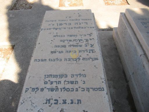 "פ"נ נאמנה כפופה נאמנה פשוטה דינה ברמן ע"ה בת ר' בצלאל צבי חיים שלימצעק דביר נפשה גבורה י... צדקה ניב שפתיה חכמה הדרת ביתה פנימה זכרונה לברכה בלבנו חצבה נולדה בקופנהגן ג' תשרי תרע"ט נפטרה כ"ג כסלו תשד"מ לפ"ק ת.נ.צ.ב.ה. "
