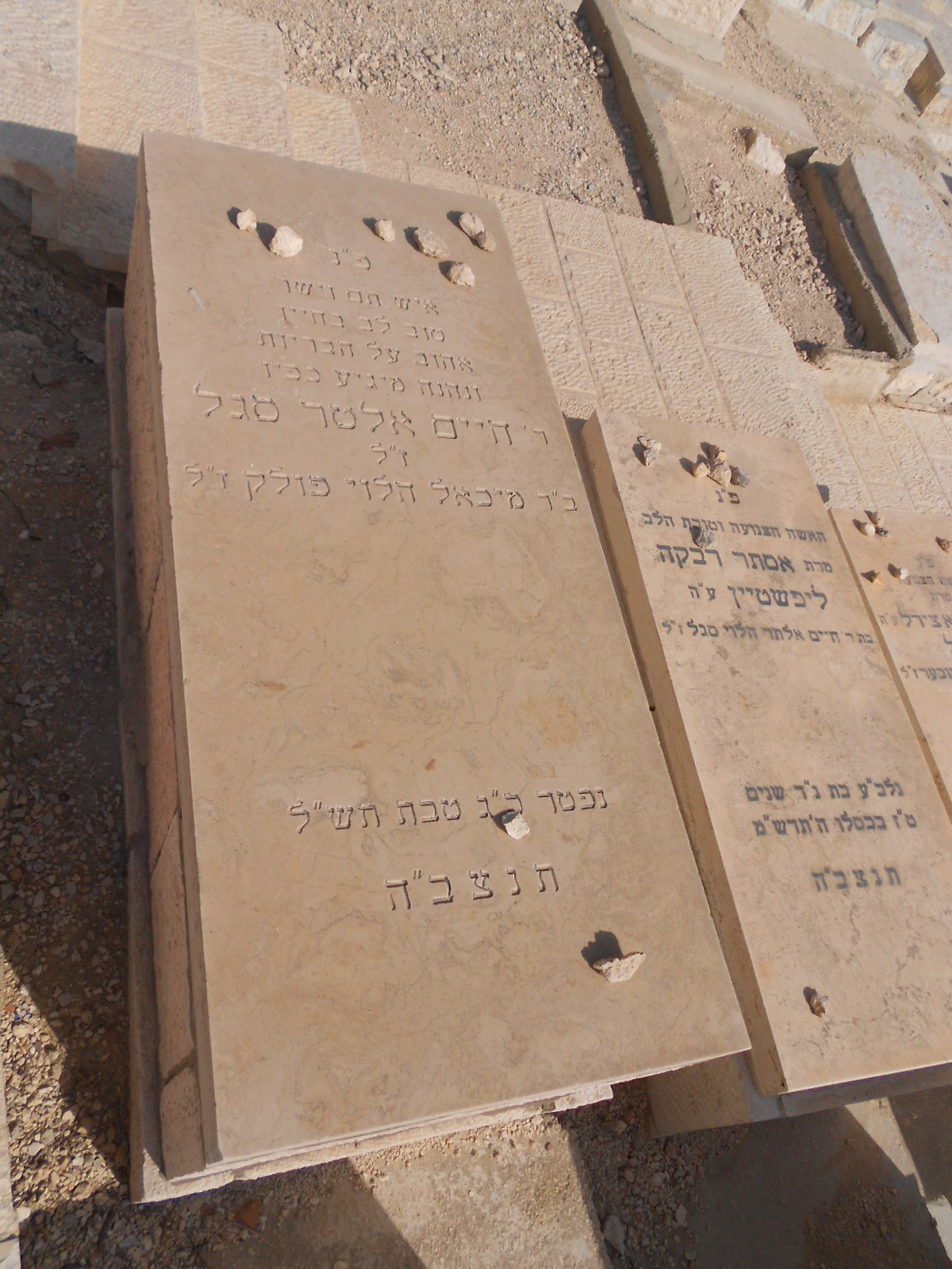 "פ"נ איש תם וישר טוב לב בחייו אהוב על הבריות ונהנה מיגיע כפיו ר' חיים אלטר סגל ז"ל ב"ר מיכאל הלוי פולק ז"ל נפטר כ"ג טבת תש"ל תנצב"ה "