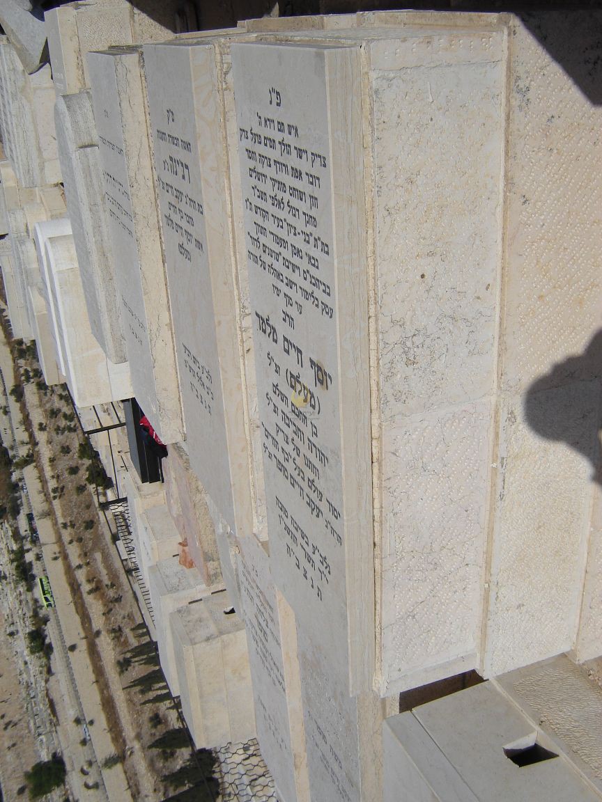 "פ"נ איש תם וירא ה' צדיק וישר הולך תמים פועל צדק דובר אמת ורודף צדקה וחסד חזן ושוחט מותיקי ירושלים מחנך דגול לאלפי תשב"ר בת"ת "בני - ציון" בעיר הקודש ת"ו גבאי נאמן ומעמודי התווך בביהכנ"ס וישיבת "שושנים לדוד" עסק בלימוד וישב באהלה של תורה עד סוף ימיו הרב יוסף חיים מלמד (מעלם) זצ"ל בן החכם השלם יהודה וחביבה זצ"ל וחתנו של צדיק יסוד עולם בעל "כף החיים" הרה"ג יעקב חיים סופר זצ"ל נלב"ע בשיבה טובה י"ד תשרי התשנ"ו תנצב"ה " יוסף חיים מלמד