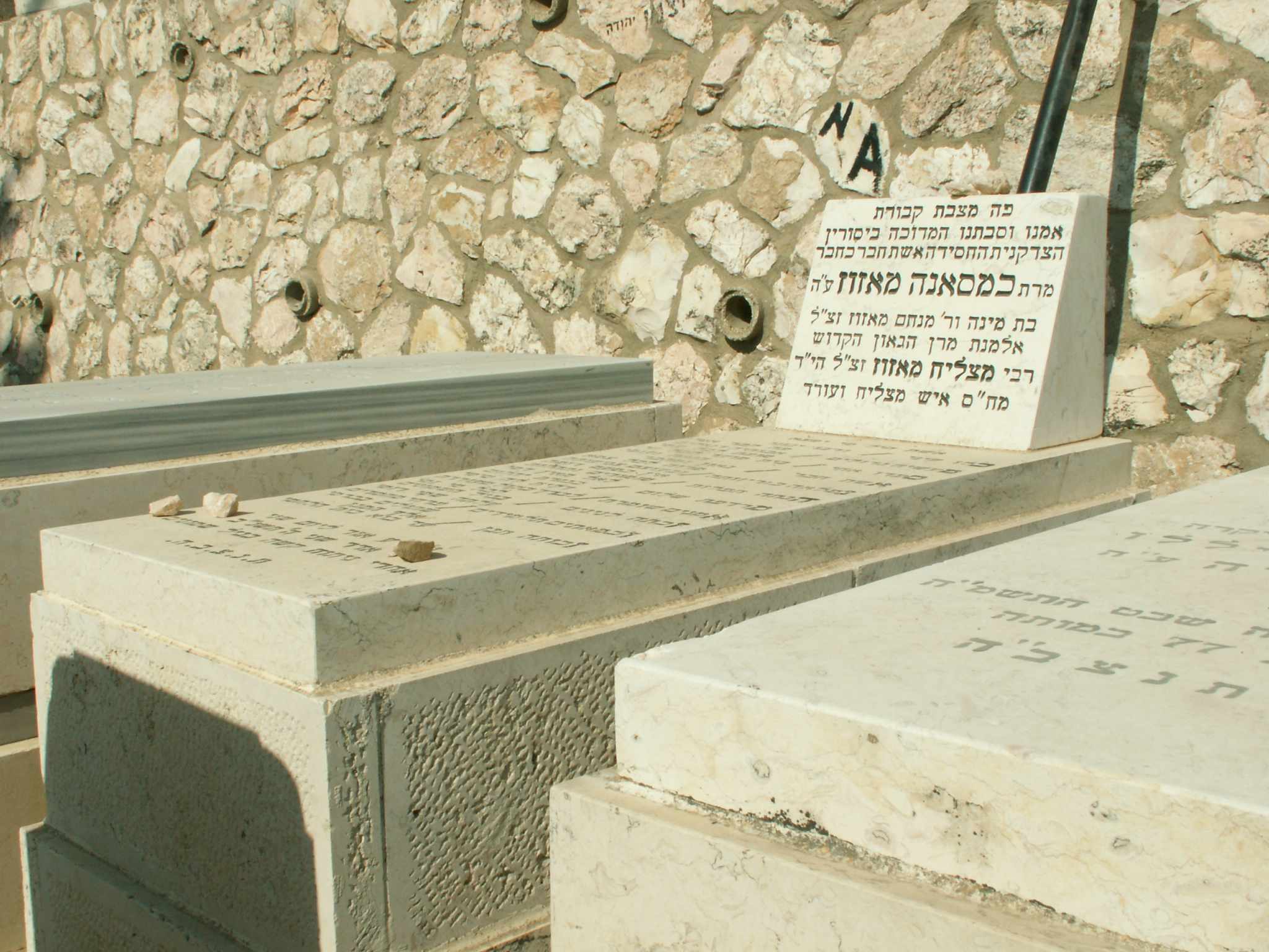 "פה מצבת קבורת אמנו וסבתנו המדוכה ביסורין הצדקנית החסידה אשת חבר כחבר מרת כמסאנה מאזוז ע"ה בת מינה ור' מנחם מאזוז זצ"ל אלמנת מרן הגאון הקדוש רבי מצליח מאזוז זצ"ל הי"ד מח"ס איש מצליח ועודד אשת חיל מי ימצא כלו עיני / ורבו יגוני פה קבר אמי מעשיה גדולים / אבותיה דגולים מופת לכל עמי ספרו אחי / גאון ומחבר מרוה לכל צמא נפלאה בזריזותה / ובעוצם צניעותה אין כמעט דומה הגתה תפלות / מזמורים ותהילות לאל מאין דמי מרדפת שלום / כגזרת יהלום דלית לה טימי אמנים שומרת / לברך בקול מעוררת לכל מי ומי זכתה לנינים / בגיל השמונים עלתה שמי רומי וכמאתים תלמידים / פרחי מחמדים שתולים בכרמי זכותה תגן / אלף המגן עד בוא בית הלחמי נלב"ע אור ליום שני ד' אדר שני ה' תשנ"ב אחרי ניתוח קשה בגיל שמונים ת.נ.צ.ב.ה. " כמסאנה מאזוז