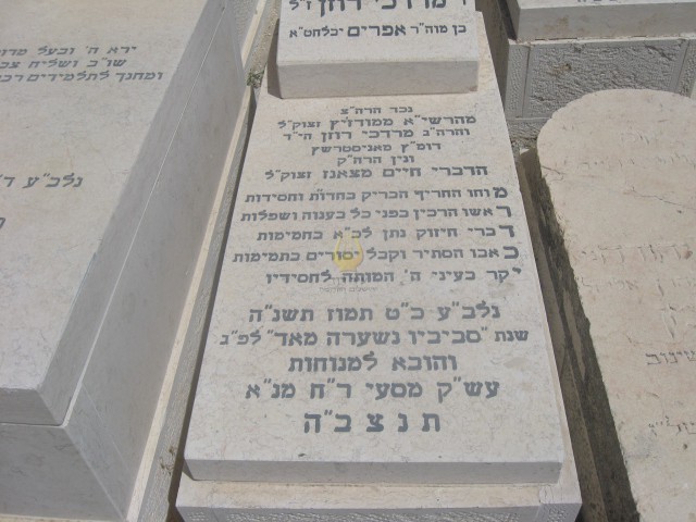 "פ"נ הרה"ח ר' מרדכי רוזן ז"ל בן מוה"ר אפרים יבלחט"א נכד הרה"צ מהרשי"א ממודז'יץ זצוק"ל והרה"ג מרדכי רוזן הי"ד דומ"ץ מאניסטרשץ ונין הרה"ק הדברי חיים מצאנז זצוק"ל מוחו החריף הבריק בחדו"ת וחסידות ראשו הרכין בפני כל בענוה ושפלות דברי חיזוק נתן לכ"א בחמימות כאבו הסתיר וקבל יסורים בתמימות יקר בעיני ה' המותה לחסידיו נלב"ע כ"ט תמוז תשנ"ה שנת "סביביו נשערה מאד" לפ"ג והובא למנוחות עש"ק מסעי ר"ח מנ"א תנצב"ה ר' מרדכי רוזן ז"ל" מרדכי רוזן