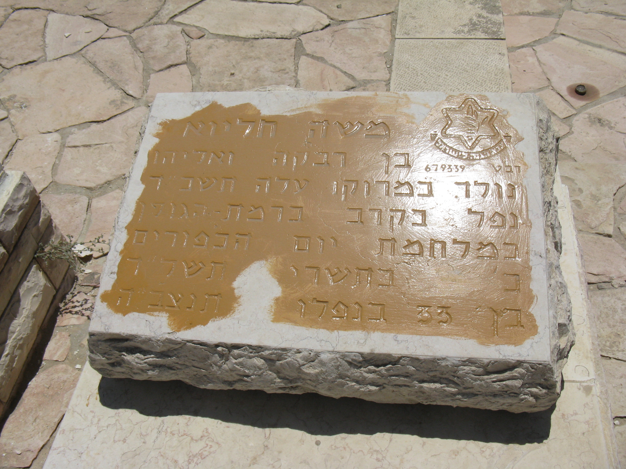 "משה חליוא בן רבקה ואליהו נולד במרוקו עלה תשכ"ד נפל בקרב ברמת-הגולן במלחמת יום הכפורים כ' בתשרי תשל"ד בן 33 בנפלו תנצב"ה " משה חליוא
