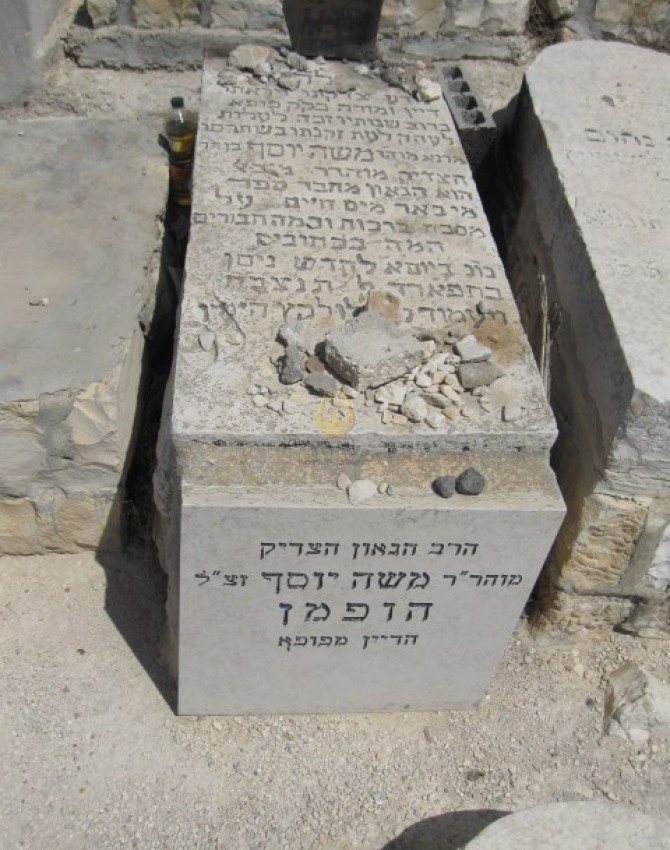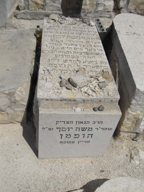 "נודע צדקתו ויראתו דיין ומורה בק"ק פופא ברוב שנותיו זכה לעלות לעה"ק לעת זקנתו בש תרםו מרנא מוה'ר משה יוסף בן הר הצדיק מוהרר מיכאל זצ"ל הוא הגאון מחבר ספר מי באר מים חיים על מסכת ברכות וכמה חבורים המה בכתובים נו"נ ביום א לחדש ניסן בתפארה ל תנצבה ותעמוד לו לקץ " משה יוסף הופמן “הדיין מפאפא”