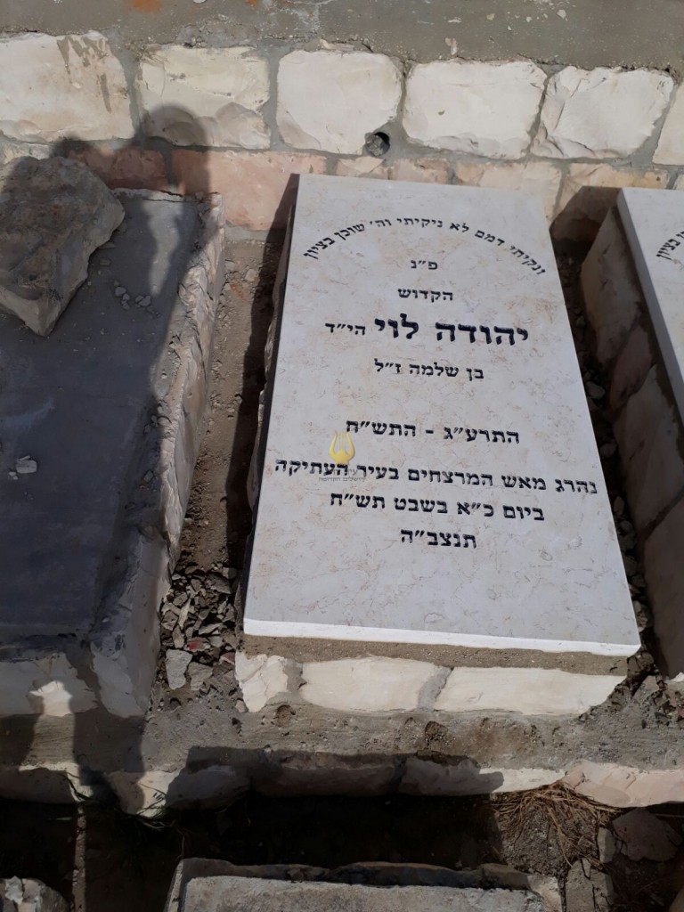 "ונקיתי דמם לא ניקיתי וה' שוכן בציון פ"נ הקדוש יהודה לוי הי"ד בן שלמה ז"ל התרע"ג - התש"ח נהרג מאש המרצחים בעיר העתיקה ביום כ"א בשבט תש"ח תנצב"ה " נפגע פעולת איבה הקדוש יהודה לוי הי”ד
