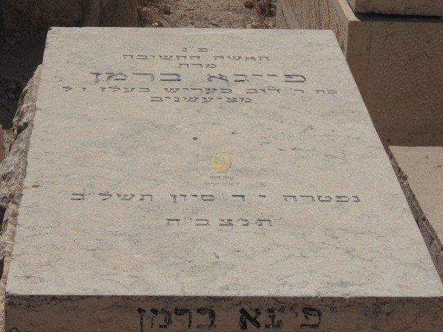"פ"נ האשה החשובה מרת פייגא ברמן בת ר' דוב בעריש בעלז ז"ל מציעשניב נפטרה י"ד סיון תשל"ב תנצב"ה פייגא ברמן" פייגא ברמן