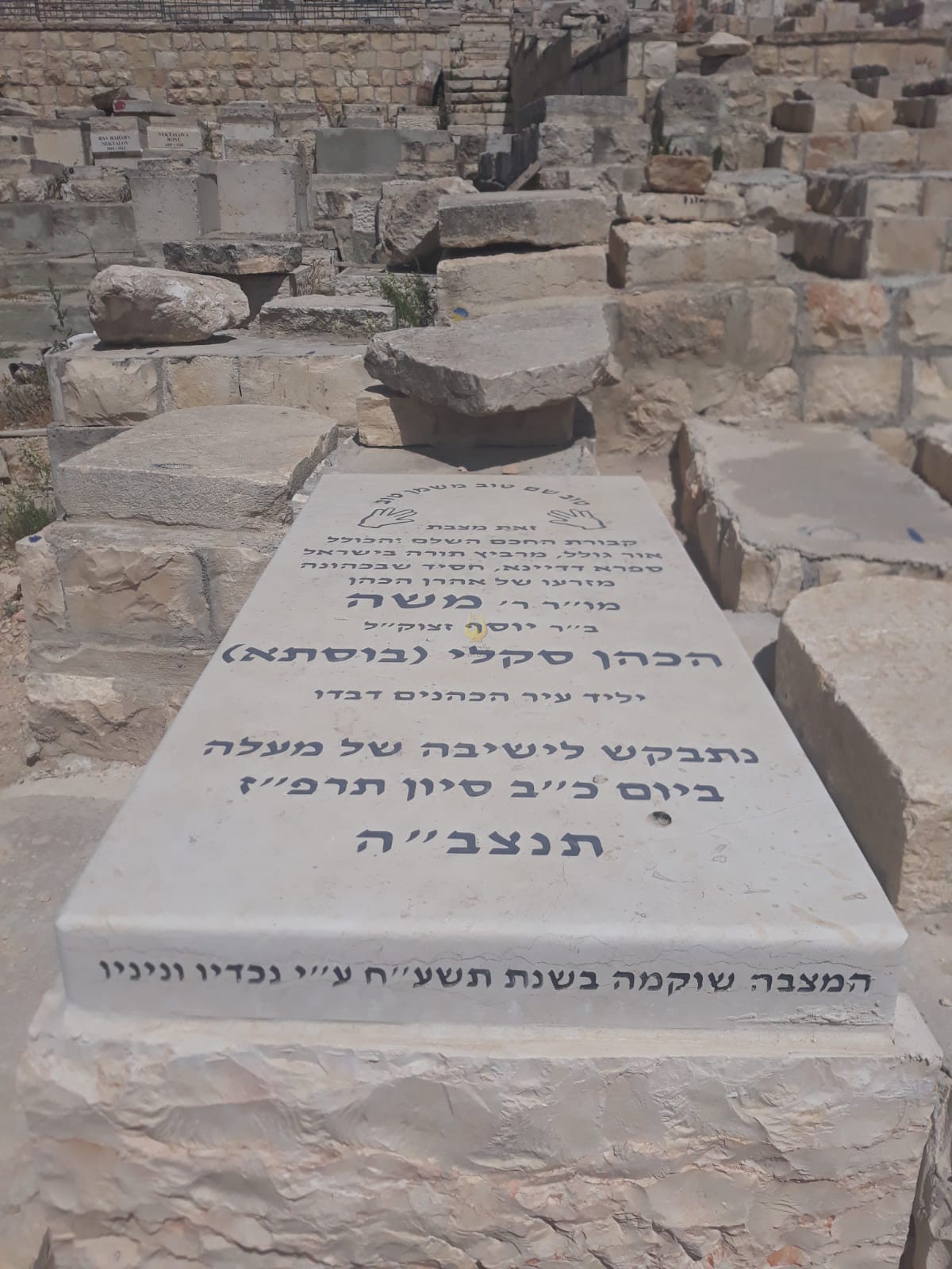 "פ"נ בעלי ואבינו היקר משה כהן בן חנה ז"ל נולד תרע"ז נפטר א' ניסן תשל"ז תנצב"ה חסידא קדישא. מרבני העיר דיבדו שבמרוקו. היה סופר סת"ם בקדושה ובטהרה בעירו דיבדו. עלה לירושלים במסירות נפש בסביבות שנת תר"ע." רבי משה הכהן מדיבדו זצ”ל