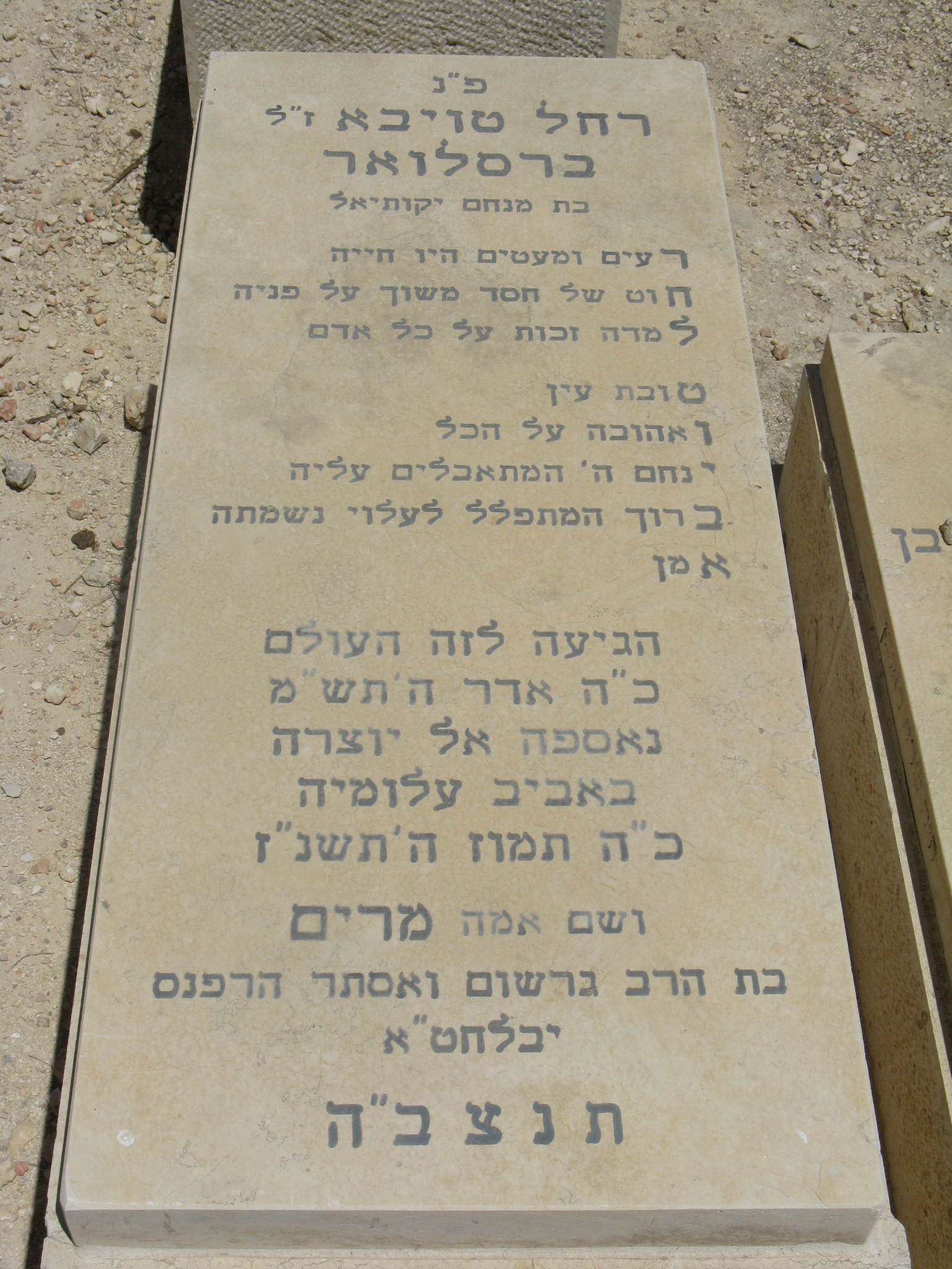 "פ"נ רחל טויבא ז"ל ברסלואר בת מנחם יקותיאל רעים ומעטים היו חייה חוט של חסד משוך על פניה למדה זכות על כל אדם טובת עין ואהובה על הכל ינחם ה' המתאבלים עליה ברוך המתפלל לעלוי נשמתה אמן הגיעה לזה העולם כ"ה אדר ה'תש"מ נאספה אל יוצרה באביב עלומיה כ"ה תמוז ה'תשנ"ז ושם אמה מרים בת הרב גרשום ואסתר הרפנס יבלחט"א תנצב"ה " רחל טויבא ברוסלואר