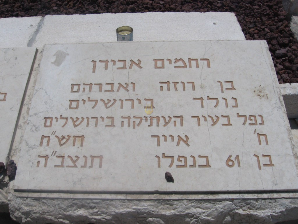 "רחמים אבידן בן רוזה ואברהם נולד בירושלים נפל בעיר העתיקה בירושלים ח' אייר תש"ח בן 61 בנפלו תנצב"ה " רחמים אבידן