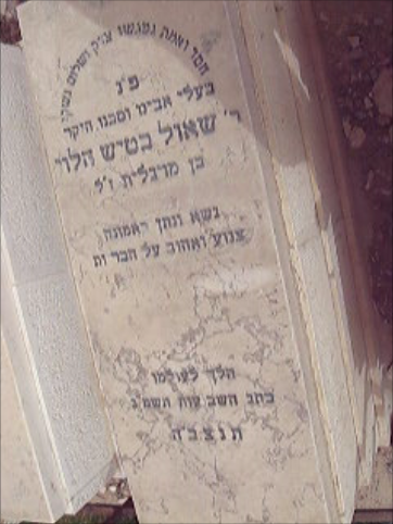 "חסד ואמת נפגשו צדק ושלום נשקו פ"נ בעלי אבינו וסבנו היקר ר' שמואל בטיש הלוי בן מרגלית ז"ל נשא ונתן באמונה צנוע ואהוב על הבריות הלך לעולמו בחג השבועות תשמ"ג תנצב"ה " שאול בטיש הלוי