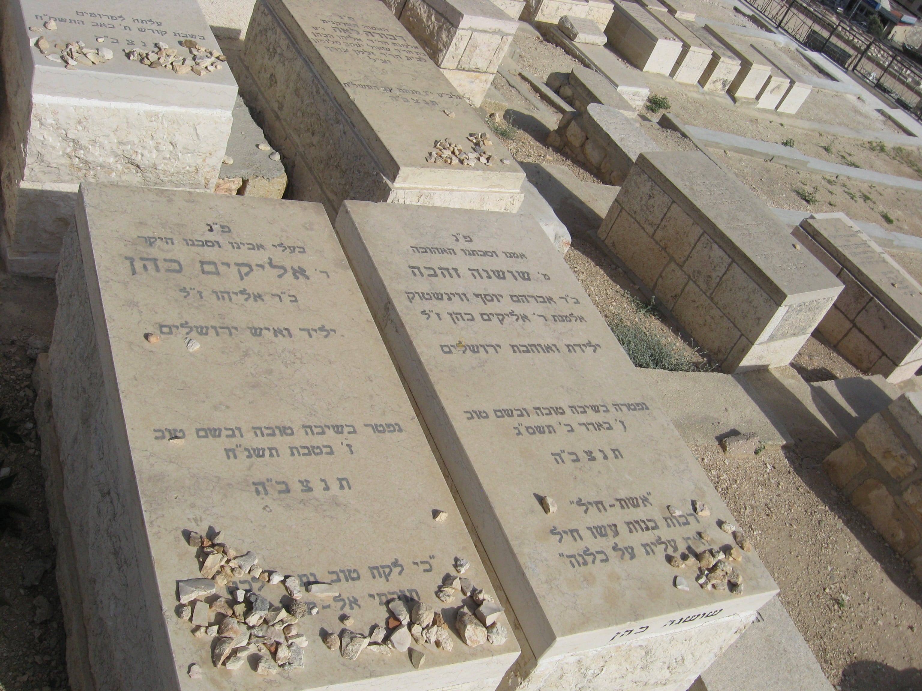 "פ"נ אמנו וסבתנו האהובה מ' שושנה זהבה ב"ר אברהם יוסף ווינשטוק אלמנת ר' אליקים כהן ז"ל ילידת ואוהבת ירושלים נפטרה בשיבה טובה ובשם טוב ז' באדר ב' תשס"ג תנצב"ה "אשת-חיל" "רבות בנות עשו חיל ואת עלית על כלנה" שושנה כהן"