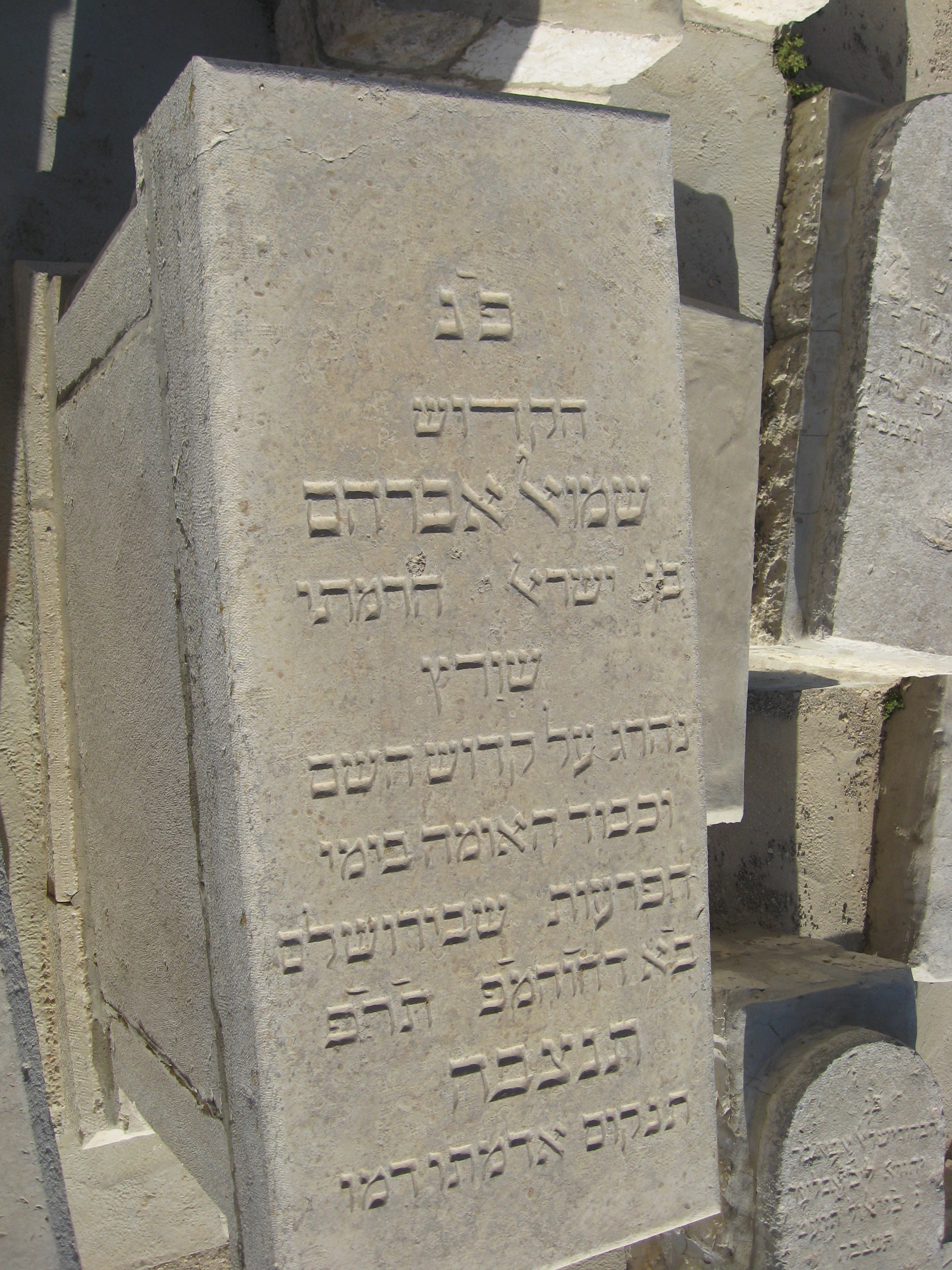 "פ'נ הקדוש שמואל אברהם הן ישראל הרמתי שורץ נהרג על קדוש השם וכבוד האומה בימי הפרעות שבירושלם ב'א דחוהמ'פ תרפ' תנצבה תנקום אדמתו דמו "
