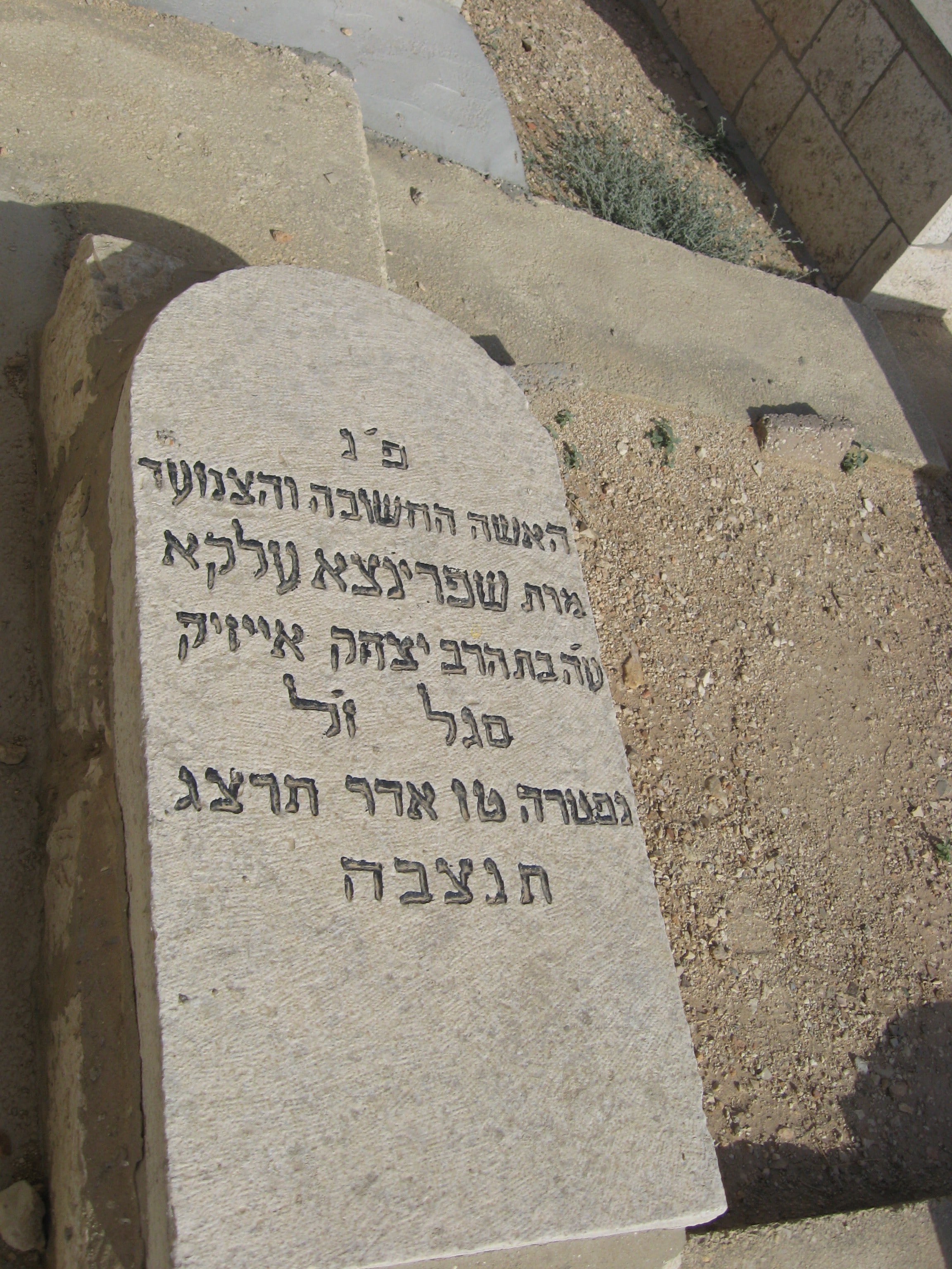 "פ"נ האשה החשובה והצנועה מרת שפרינצא עלקא ע"ה בת ר' יצחק אייזיק סגל ז"ל נפטרה ט"ז אדר תרצ"ג תנצב"ה "