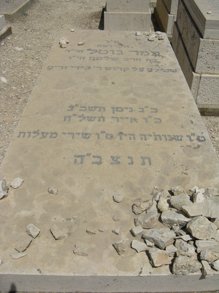 "פ"נ הקדושה תמר גוטל הי"ד בת הרב שלמה הי"ו שנפלה על קדוש ד' בידי זדים כ"ג ניסן תשכ"ג כ"ו אייר תשל"ח ט"ו שנותיה היו ט"ו שירי מעלות תנצב"ה "