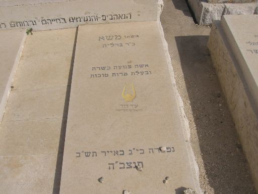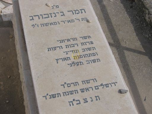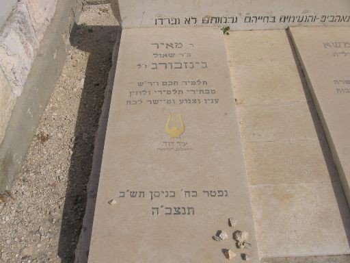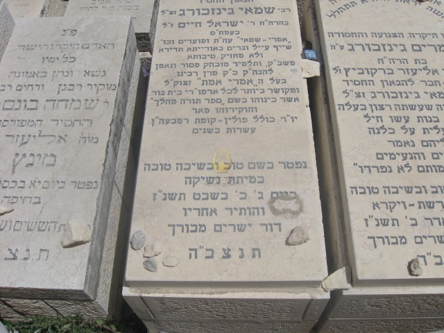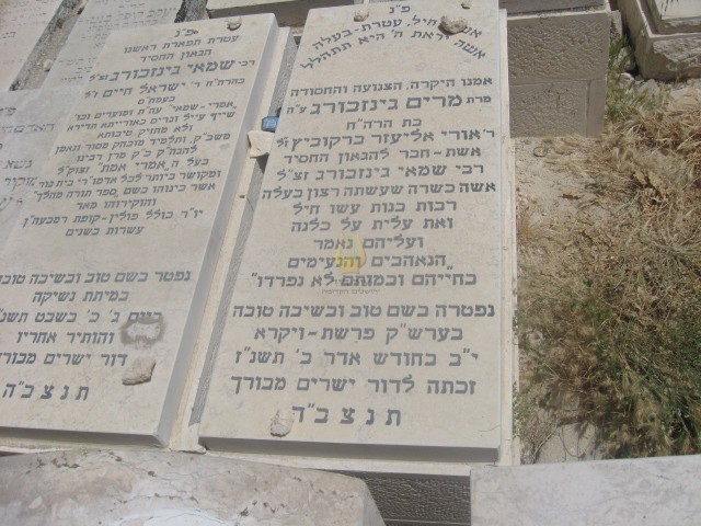 פ"נ הרב ר' קלמן בהרב ר' שלמה ז"ל גינזבורג מפינסק ששימש ארבעים שנה גבאי הישיבה ומנהל בגמ'ח בקרלין נפטר בירושלים בי'ט בטבת תרס'ה תנצבה הקבר שוקם ע"י נכדיו וניניו בתשכ"ט