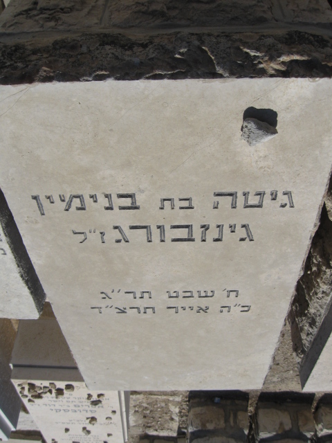 פ"נ ר' משה גד ב"ר שלמה ז"ל גינזבורג מפינסק נפטר י"ז אלול תרס"ח תנצב"ה המצבה חודשה ע"י ... בישראל .. ש. גינזבורג באמריקה .. ע. וולק ב. מילר ע. לוין פ.פרידמן אחים וינגרט