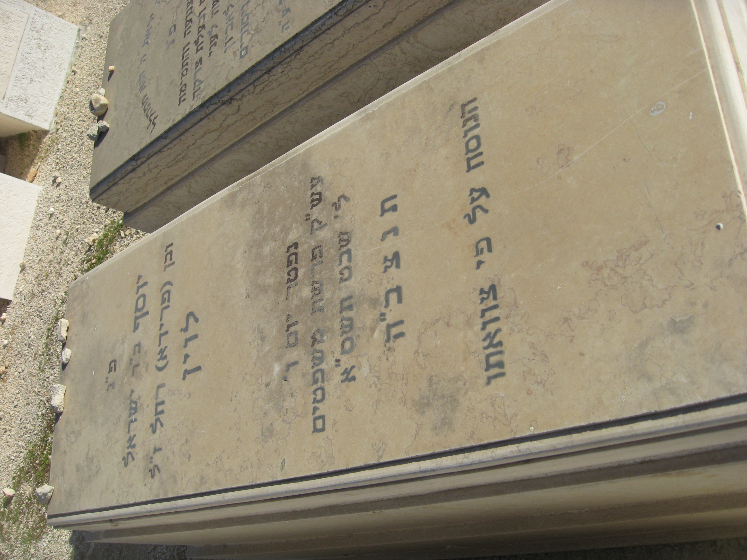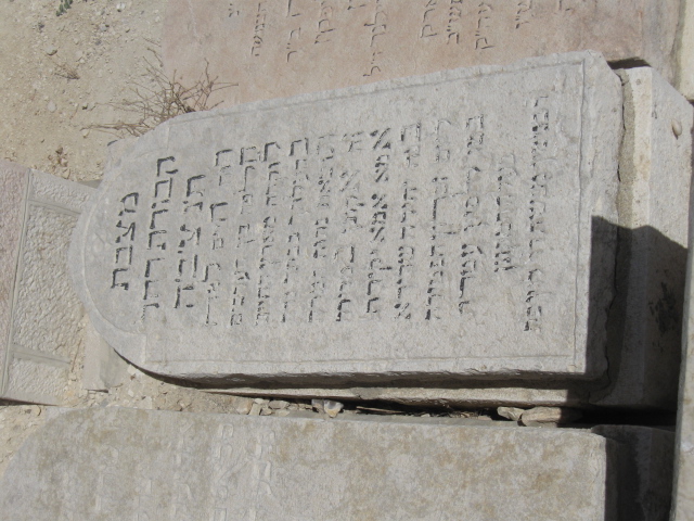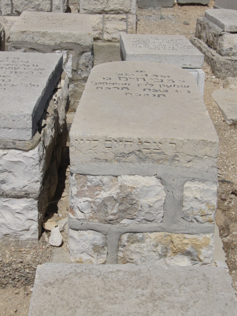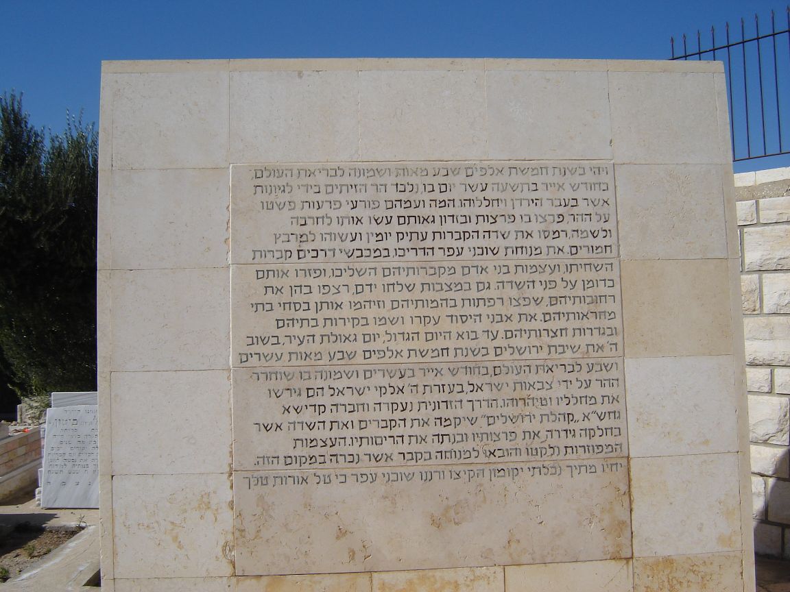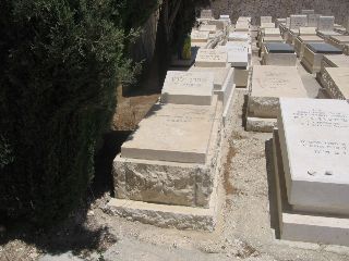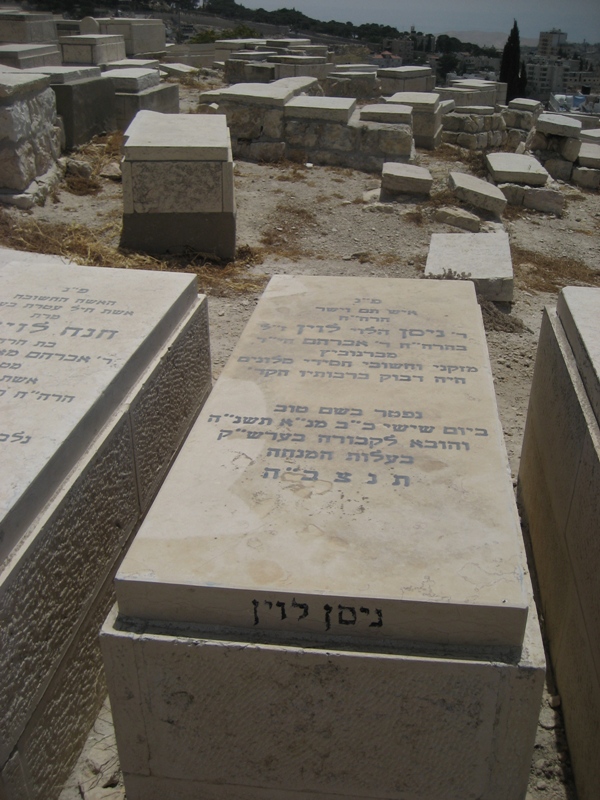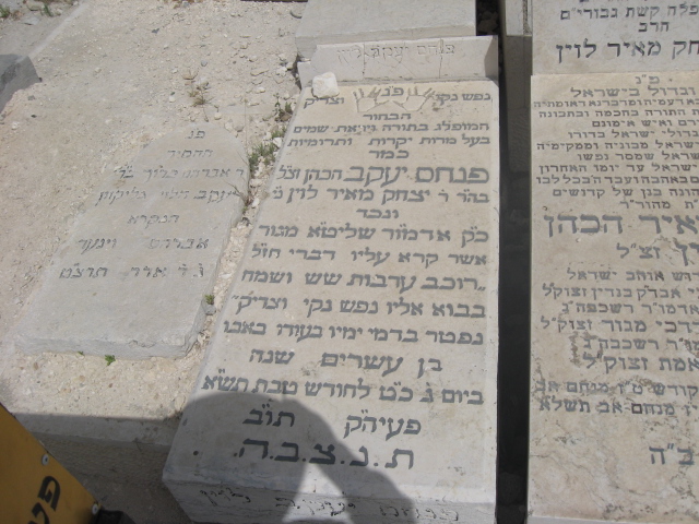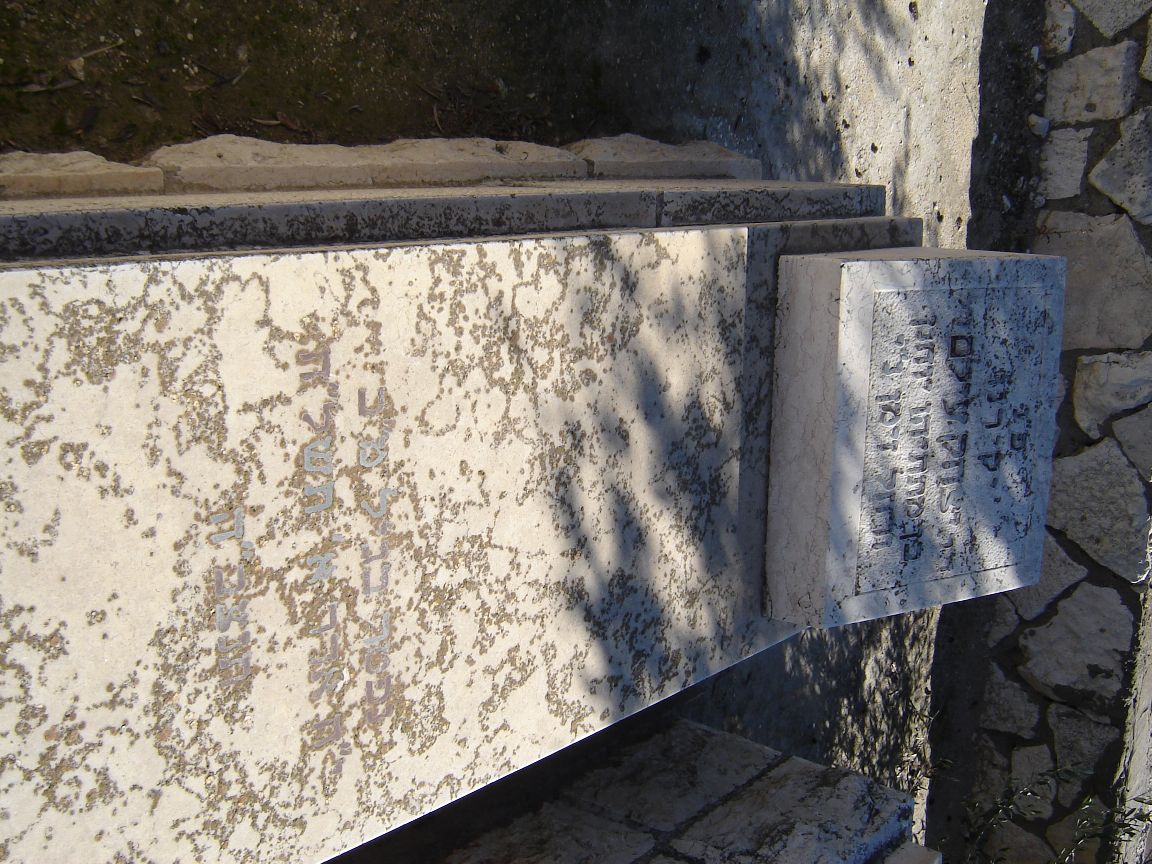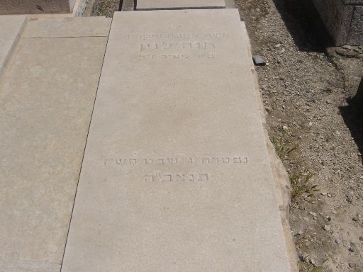פ"נ ר' אברהם יחזקאל ז"ל בה"ר ישראל איסר ז"ל לוין רודף צדקה וחסד תרם והתרים שלא ע"מ לק"ס למוסדות התורה בארץ ישראל נפטר בגולה בעיר סן_פאולה ברזיל ביום ב' תמוז תשכ"ב ולפי צואתו הועבר לקברי אבותיו בירושלים ביום י"ד במנ"א תשכ"ח תנצב"ה