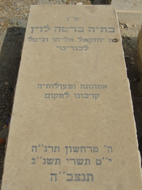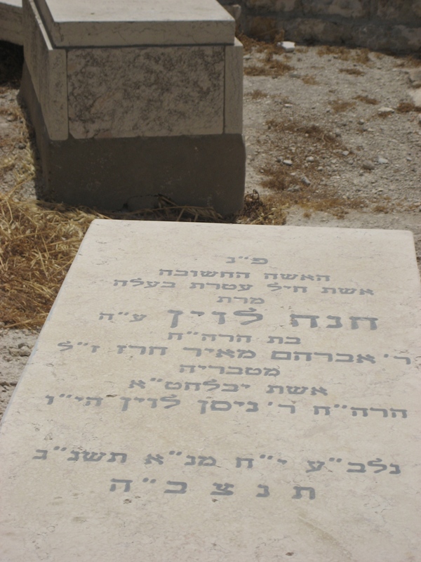 פ"נ הא' יראת ה' חיה פראדיל לוין ע"ה בהר"ר אברהם אליעזר בהגרש"ז בהר"ן זצ"ל נלב"ע י"ט אלול תרע"ז ת'נ'צ'ב'ה'