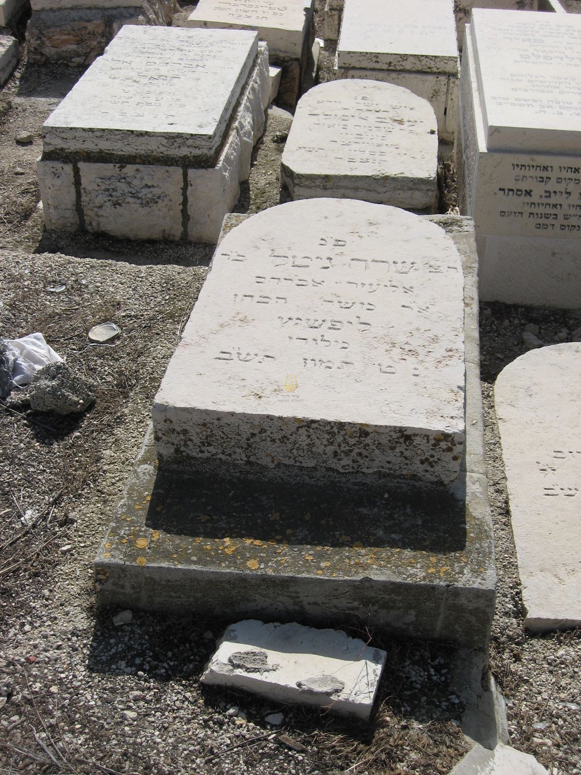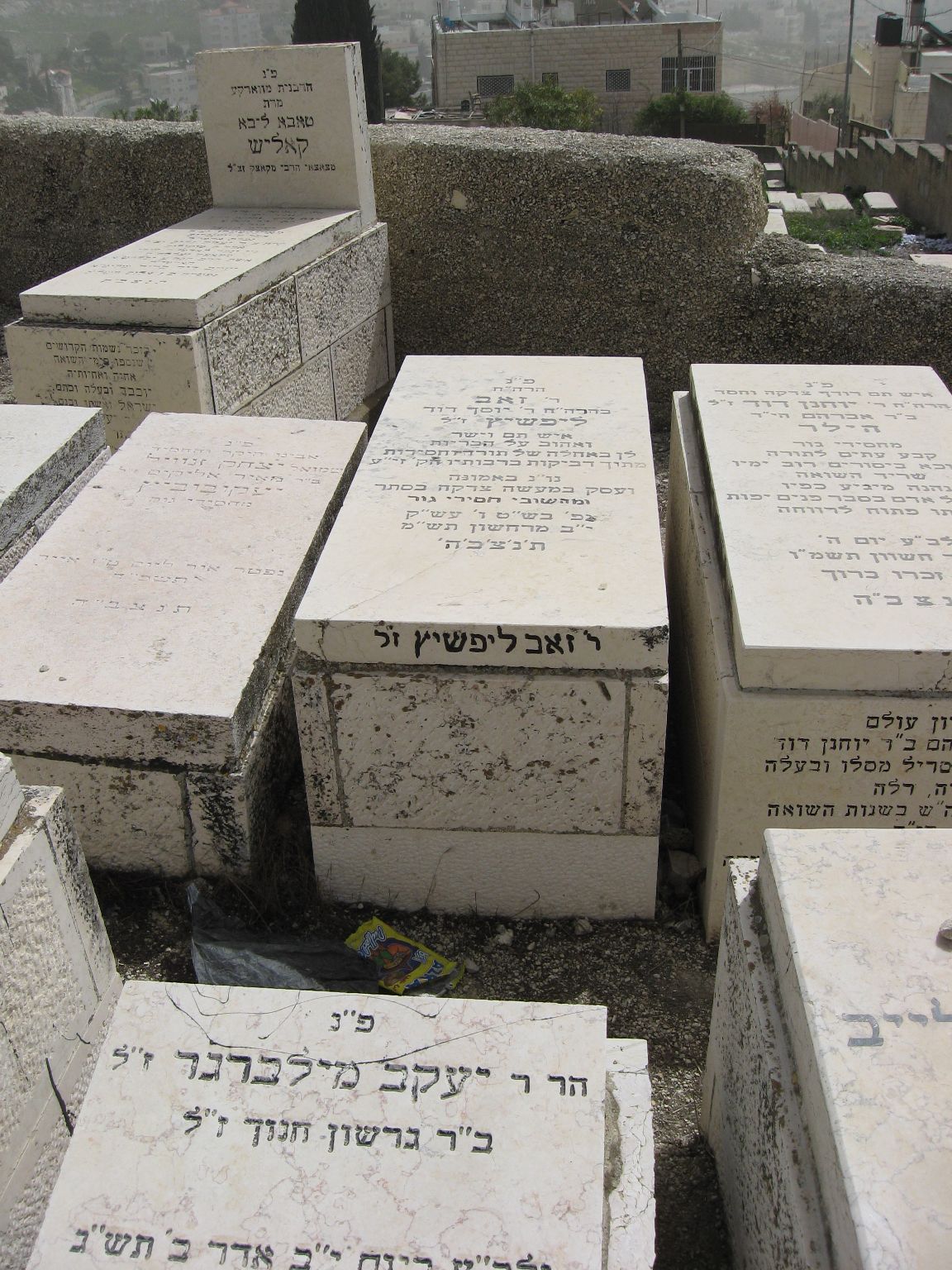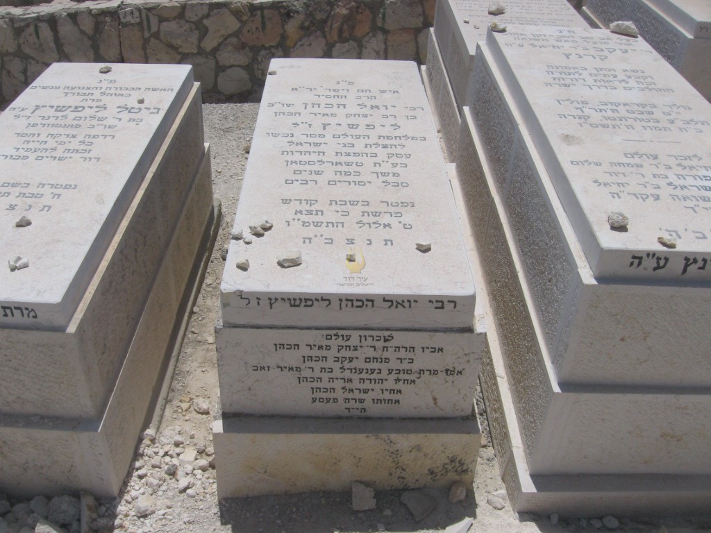 פ"נ מזקני ירושלם שחנן את עיר הקודש למעלה משבעים שנה חכם וישר רבי נפתלי לייב ז"ל בן רבי אברהם עזריאל ז"ל ליפשיץ נולד בפינסק ט' אדר תרכ"ג נפטר בירושלם ח' שבט תש"ז ת'נ'צ'ב'ה