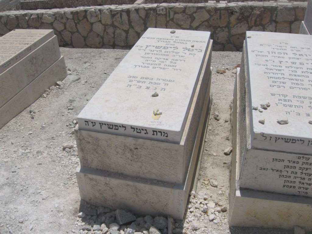 פ"נ רשי ליפשיץ בת ר' דב ופרלה קפלון ז"ל אהובה על הכל נשיאת חברת "העזרה" וממנהיגות ויצ"ו ירושלים נולדה י"א סיון תרנ"ה נפטרה א' תשרי תשמ"ה תנצב"ה