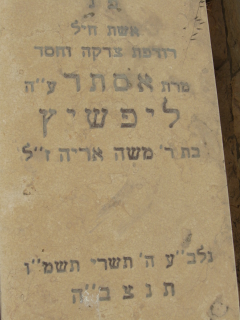 פ"נ האשה הצדקנית אסתר לאה ליפשיץ ע"ה בת הרה"ח דובער אשת המקובל הרה"צ יהושע יוסף זצ"ל נלב"ע ג' שבט תרע"ב ת.נ.צ.ב.ה. משופץ ע"י יו"ח (לברכה והצלחה)