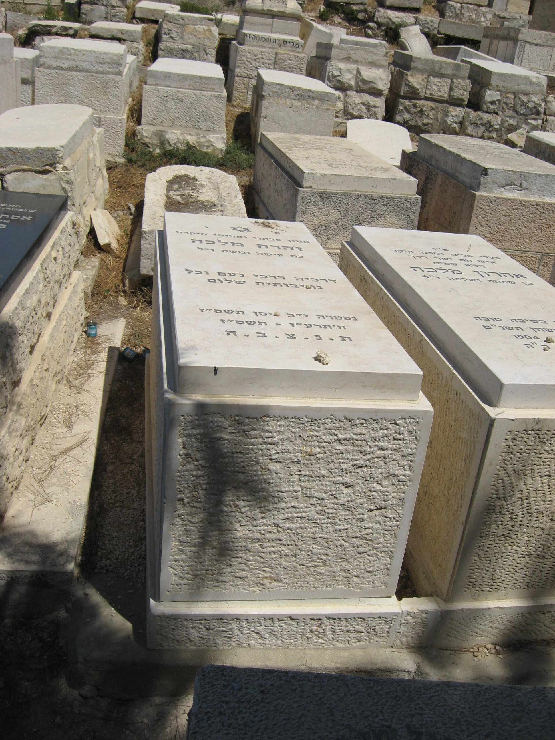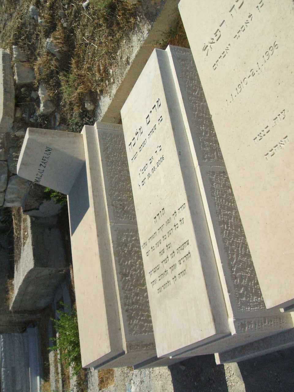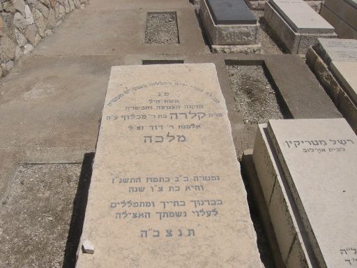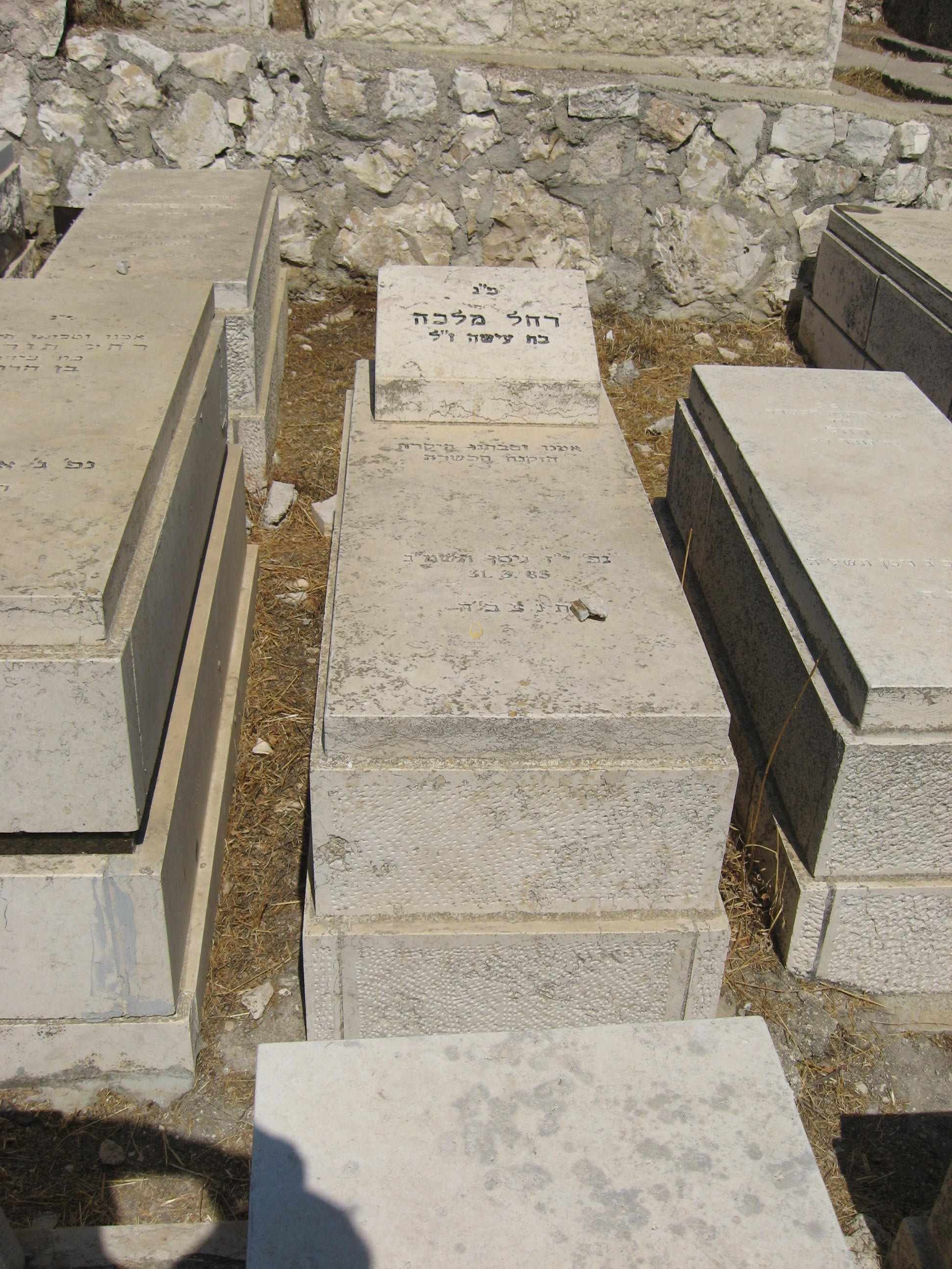 פ.נ. אשה כשרה ונכבדת רחל מלכה בת מזל ז"ל במעלות טובות מוכתרת בצדקות ובחן מעוטרת הזיו והטוב מילאו את ביתה חסד ורחמים מנת חלקה ושאיפתה דור ישרים השאירה אחריה עם איש בריתה וצאצאיה למענם מסרה נפשה לגדלם ולחנכם בדרך התורה ומצוותיה במחיצת הצדקניות תנוח נפשה ומליצת יושר תהיה לעמה ולמשפחתה נ.ל.ב.ע. כ"א טבת תשס"ט ת.נ.צ.ב.ה.