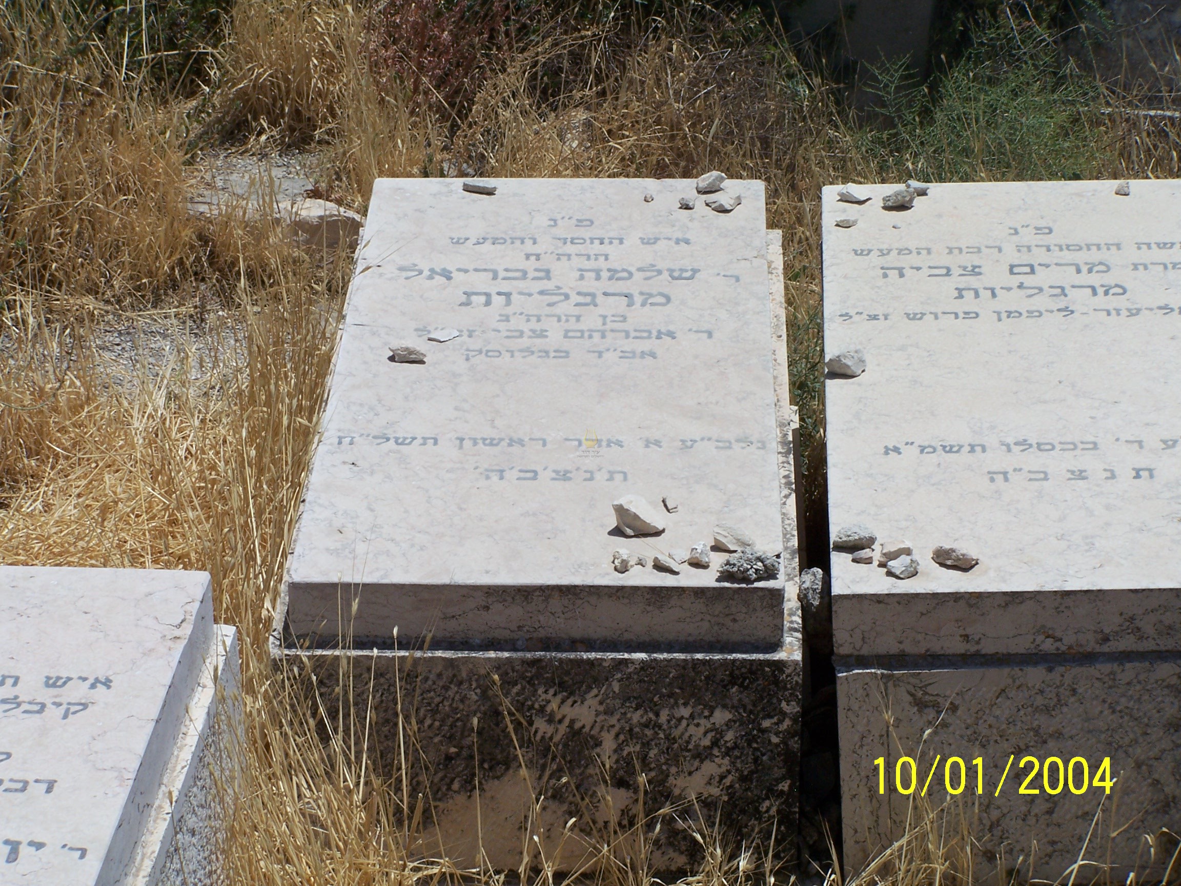 אוי לנו כי אבדה מאתנו מרגלית טובה פ"נ אשה צנועה וכשרה עטרת בעלה ותפארת בניה מרת חנה יהודית מרגליות בת ר' שמעון זעליג ז"ל תמימה באמונתה וישרה בכל דרכיה אהובה לכל בנועם מידותיה אצילת נפש טובת לב ועדינה במעשיה קבלה יסוריה באהבה נלב"ע ח' מנחם אב ה'תשנ"ה תנצב"ה