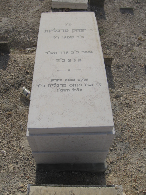 אשרי האיש אשר עסק רבות בתורת התנ"א רשב"י זיע"א הרב החסיד ישעיה אשר זעליג מרגליות ז"ל בהרה"ח יעקב צבי ז"ל ומרת מעני רעכיל הי"ד מגזע הגאון הקדוש מהרי"ל מרגליות ז"ל ולמעלה בקודש בעל הלבושים ז"ל והגה"ק בעל ברוך טעם ז"ל נלב"ע ג' פרשת טהרה ז"ך ניסן לספירת הוד שבגבורה ה'תשכ"ט ת'נ'צ'ב'ה'