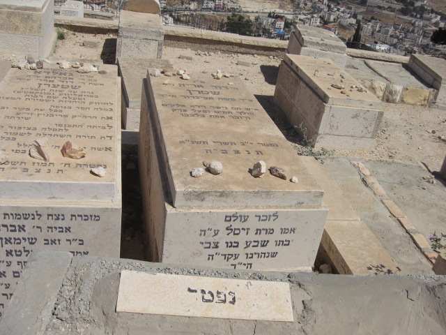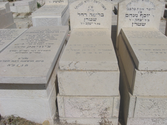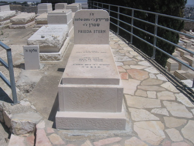 פ'נ אמנו היקרה גולדה מרים בת הר'ר זלמן נתן הלוי ספיר ז'ל אלמנת המנוח הר'ר שמעון יחזקאל שטרן ז'ל נפטרה בירושלים ביום ג' שבט התרע'ט תנצבה הקבר שוקם בתשכ'ט