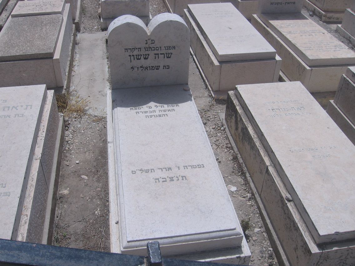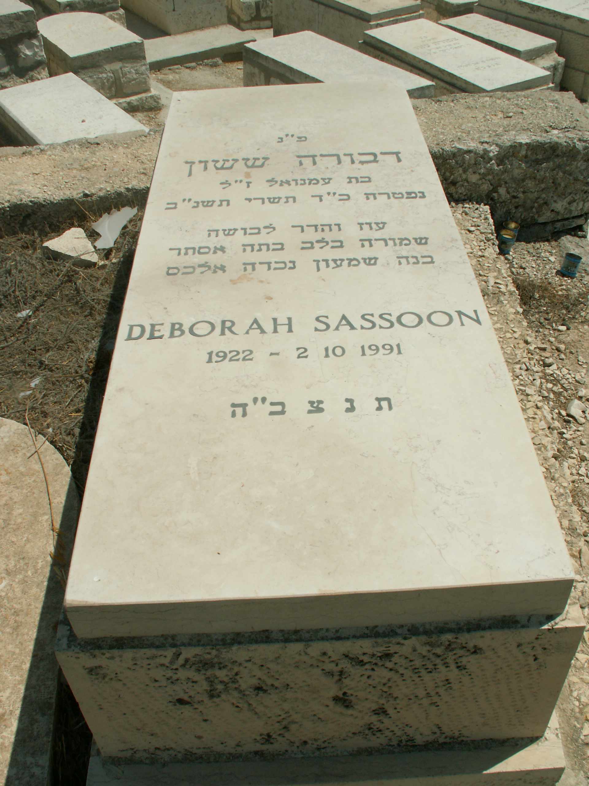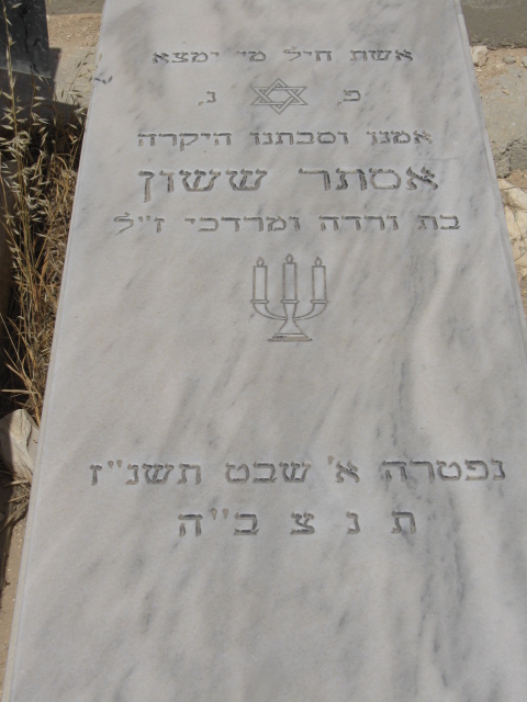 אשת חיל מי ימצא ורחוק מפנינים מכרה פ"נ האשה הכבודה והצנועה מרת אסתר ששון בת וידה נפטרה ביום יא תשרי שנת הת'רצ'ד תנ'צב'ה